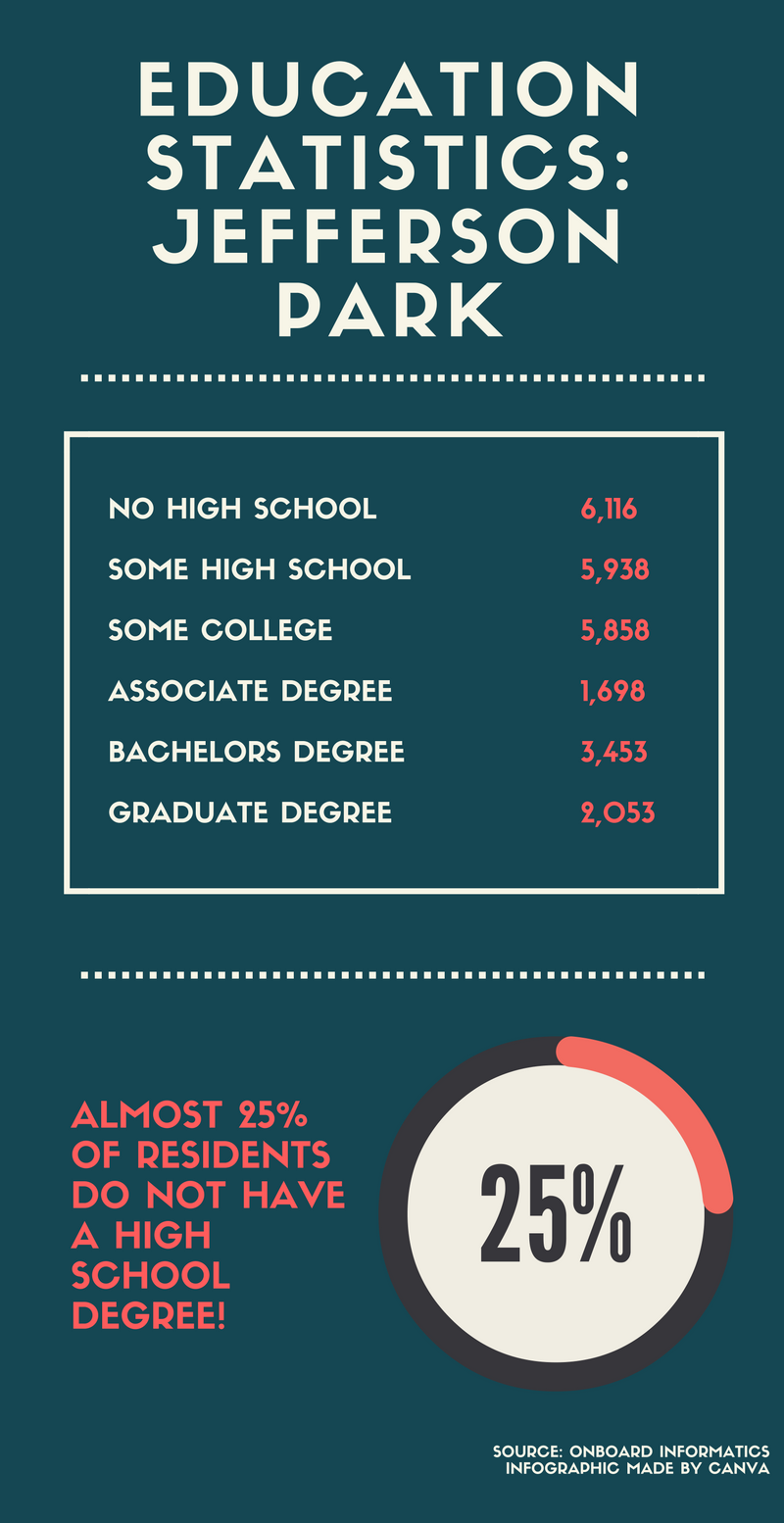 Jefferson Park is not doing well in its education sector compared to the rest of Los Angeles. According to the Los Angeles Times, only 11.8% of residents 25 or older have a four-year degree and the percentage of residents 25 and older with less than a high school diploma is high for the county. Onboard Informatics reflects that in 2014, 6116 residents in the neighborhood do not have a high school diploma.